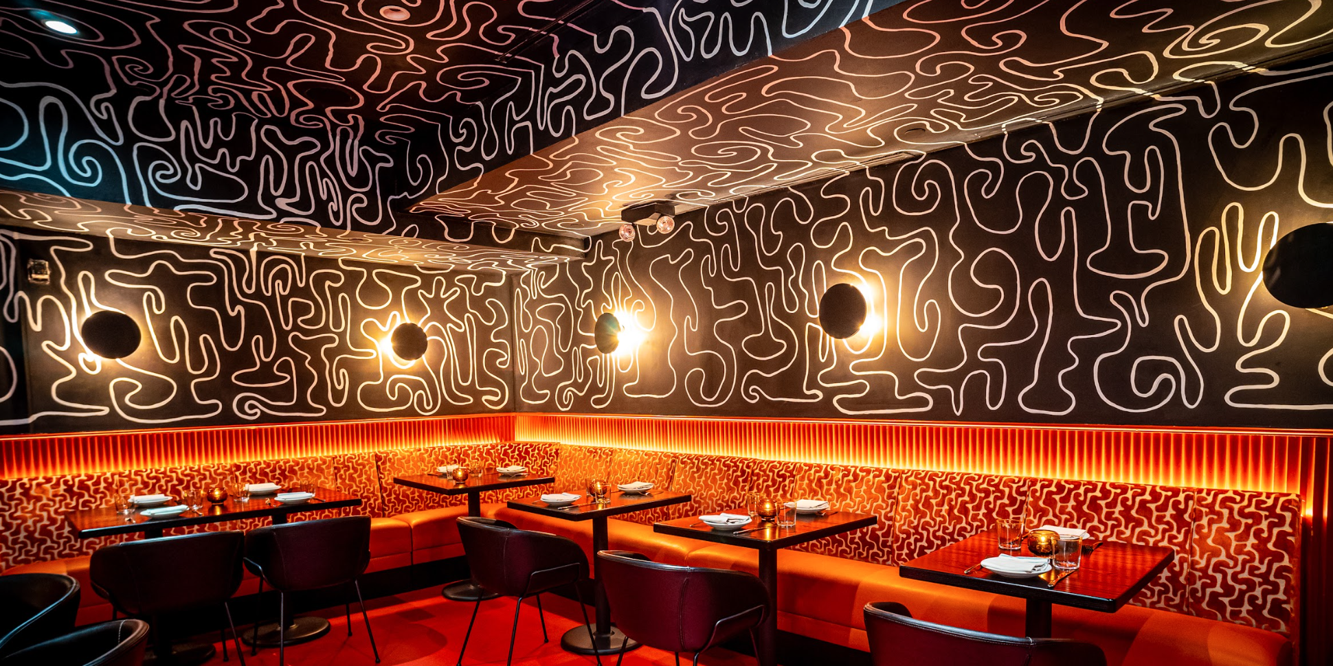 The design consists in one continue line that doesn’t intercept with any other line, overflowing beams and ceiling and creating a 3-D effect to immerse the viewer in a magical experience to discover multiples shapes and imagines from their imagination.