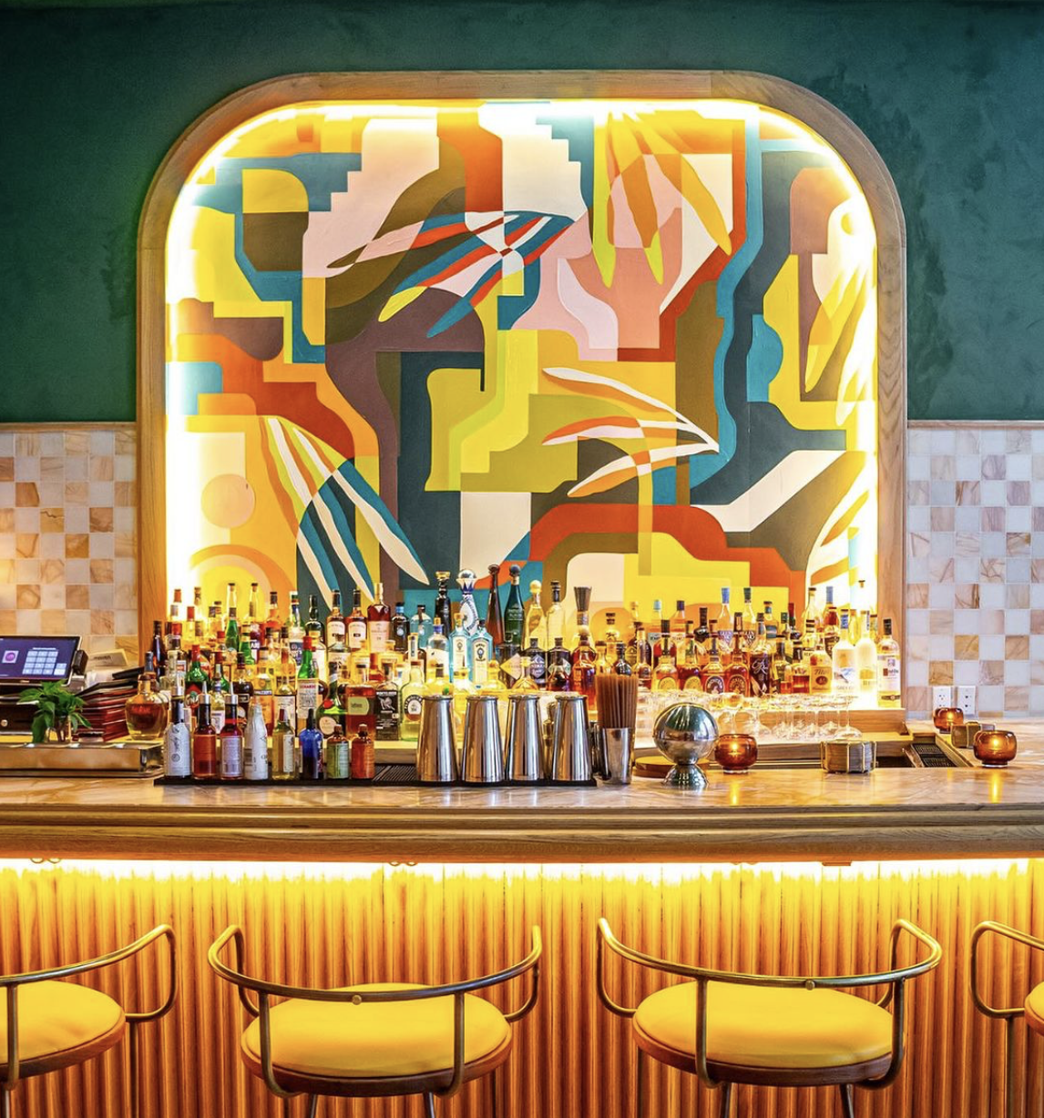 The colorful mural behind our bar and on the back wall of the restaurant was designed and hand painted by an artist named Juliana Lupacchino.
